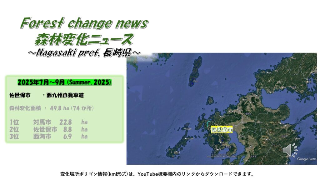 【森林変化】長崎県(2025年7月~9月) 2025 11/06 ニュース 7-9月 2025年11月6日 Forest change newshttps://youtu.be/bve00IXyHwo 森林付箋 佐世保市では、西九州自動車道建設に伴った森林変化がみられました。対馬市で見られた森林変化箇所では、GSVで“新しい道路を作っています“という看板がみられました佐世保市宇久島では、太陽光発電事業予定地となっている2か所で、森林変化がみられました。 森林付箋 Google Mapsで、今回検出された森林変化箇所を全て確認できます。 根拠となったリンク先を示していますが、リンク切れの場合がございますので、ご了承ください。 ニュース 7-9月 長崎 発電所 道路 よかったらシェアしてね! URLをコピーしました! URLをコピーしました! 【森林変化】群馬県(2025年7月~9月) 【森林変化】沖縄県(2025年7月~9月) この記事を書いた人 foresttags この著者の記事一覧へ コメント コメントする コメントをキャンセルコメント ※ 名前 ※ メール ※ サイト 次回のコメントで使用するためブラウザーに自分の名前、メールアドレス、サイトを保存する。 Δ