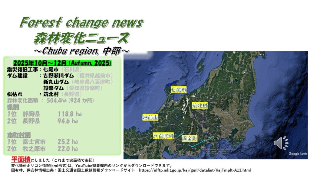 Forest change news YouTubeはありません。 美作市では、美作岡山道路建設による森林変化がみられました。(N226)真庭市では、ゴルフ場跡地での発電所建設による森林変化がみられました。(N188) Google Mapsで、今回検出された森林変化箇所を全て確認で... -