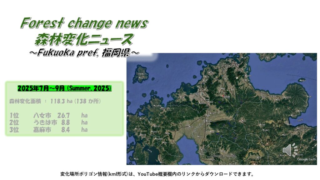 Forest change news 直方市と鞍手町の境にある、くらてIC近くでは、直方・鞍手新産業団地建設に伴った森林変化が見られました。 福岡市西区の保安林内では、今回福岡県で3番目の大きさとなる、4haの森林変化が見られました。 2024年全体で、これ以外の主な... -