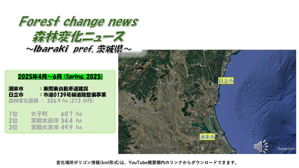 Forest change news 潮来市では、引き続き東関東自動車道建設による森林変化が見られました。日立市でも、引き続き市道0139号線道路整備事業による森林変化が見られています。また、同じく日立市の保安林かつ国有林では、今回茨城で3番目の大きさとなる8ha... -